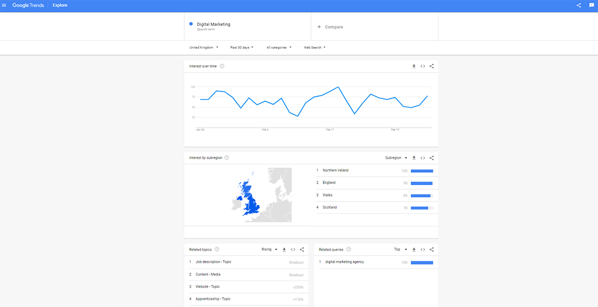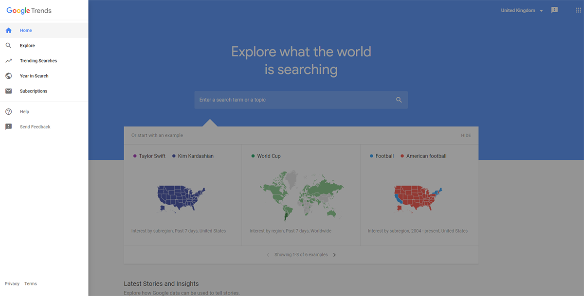 Google Trends allows you to see what is trending in terms of Google searches and is able to give you an insight both nationally and globally into what people are searching for, in both real-time, and on a daily basis.