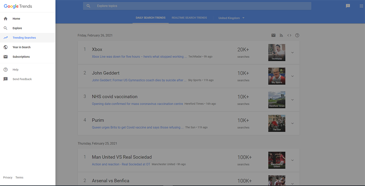 As you can see in the image above, by simply changing our setting to the UK and looking at daily search trends, we are given the Top 5 searches which in this case includes Xbox and John Gebbert making today’s Top 5 for the UK.