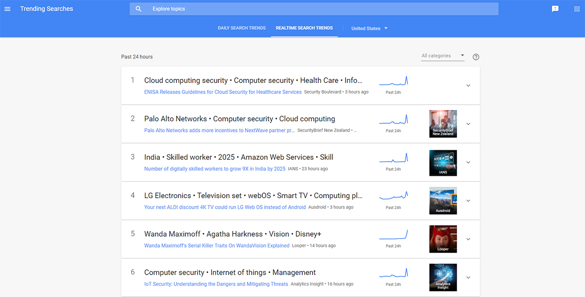 If we were to look at the top searches in real-time, you can see that we can view the searches, where the results link searchers with a small graph that shows its progress over the last 24 hours.