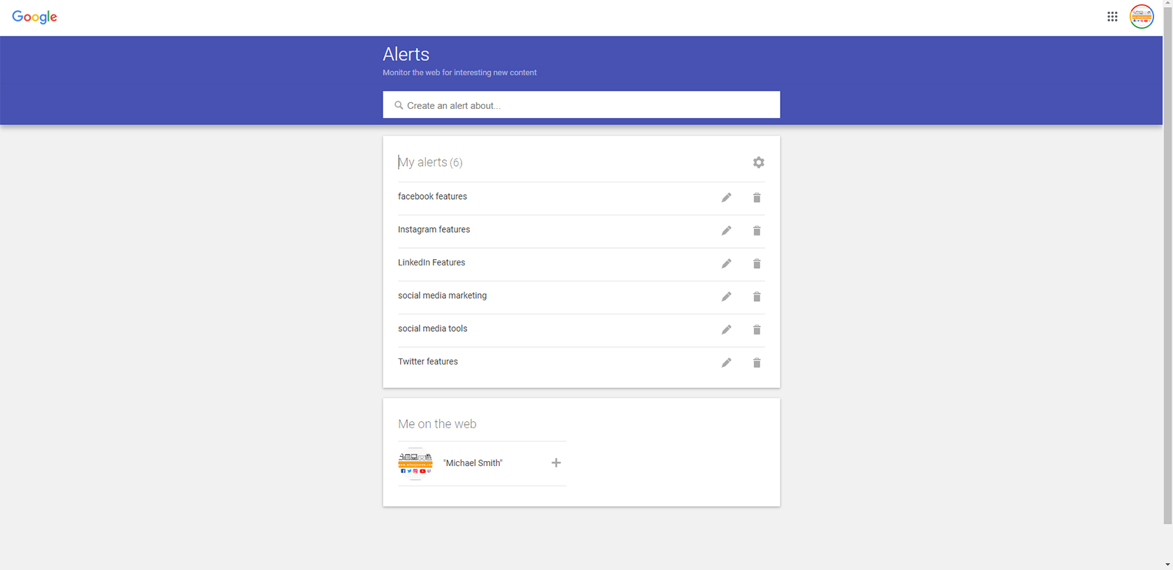 Google also sets up optional alerts for your Google email address and account name so you can see where you might be appearing on the web in articles and web searches.