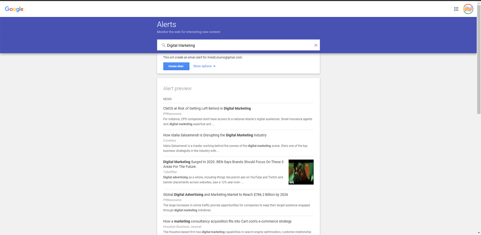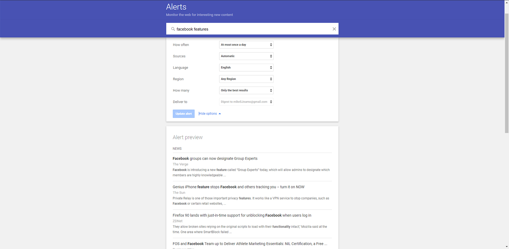 It is a free tool from Google that allows you to customize the frequency you get notified and allows you to have curated and customized content delivered directly to your email address on a daily or weekly basis. Within your custom email, Google will essentially give you a newsletter-style email that will feature stories and articles on all the keywords that you have asked to be notified about.