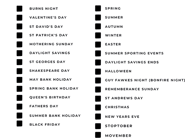 Throughout the year there are many opportunities for you and your business to take advantage of seasonal content on social media platforms and your website.